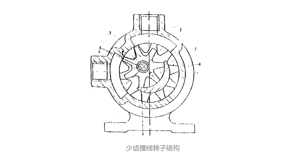 轉(zhuǎn)子結(jié)構(gòu)為少齒差擺線轉(zhuǎn)子結(jié)構(gòu),轉(zhuǎn)子齒形為短幅外擺線的內(nèi)等距曲線,與傳統(tǒng)的一齒差擺線轉(zhuǎn)子結(jié)構(gòu)相比,不易產(chǎn)生咬死現(xiàn)象。