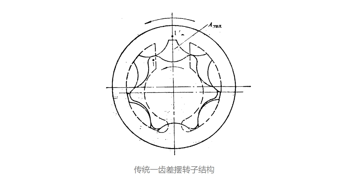 傳統(tǒng)的一齒差擺轉(zhuǎn)子結(jié)構(gòu),如圖,由于沒有起密封作用的月牙板在整個運轉(zhuǎn)過程中兩個轉(zhuǎn)子始終處在全嚙合狀態(tài),齒面滑移大,極易出現(xiàn)咬死現(xiàn)象,而少齒擺線轉(zhuǎn)子結(jié)構(gòu),如圖,一般為2齒差或3齒差,由于采用月